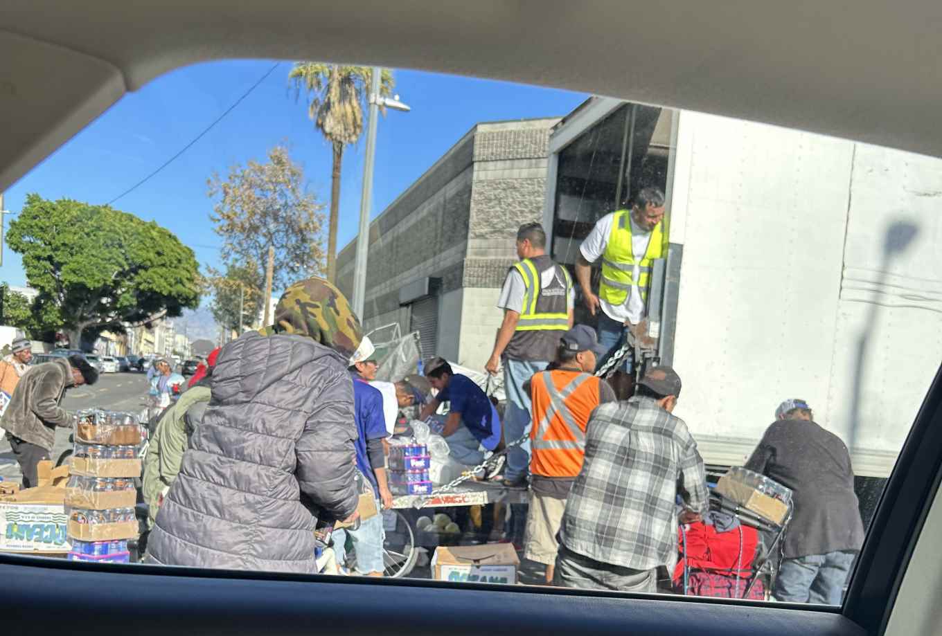 Các nhà hảo tâm chở thực phẩm phân phát miễn phí cho các người vô gia cư.